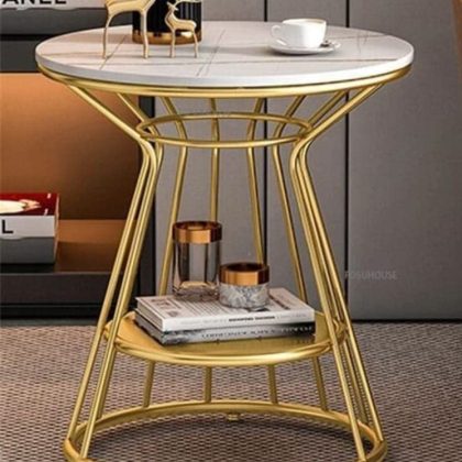 Coffee Table for Living Room, Iron Sofa Table with a marbleized Appearance, Golden Round Table, Leisure Reading Table-White Gold